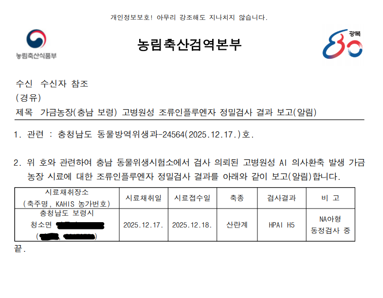 (충남 보령) 예방적 살처분 가금농장(산란계) 고병원성 조류인플루엔자(AI) 확진에 따른 방역조치 알림