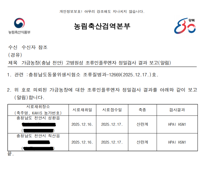 (충남 천안) 예방적 살처분 가금농장(산란계) 고병원성 조류인플루엔자(AI) 확진에 따른 방역조치 알림