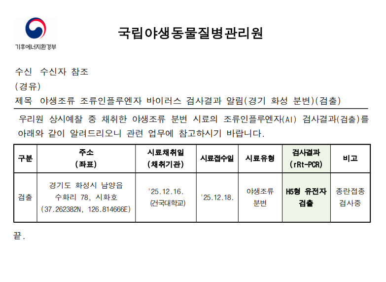 (경기 화성) 야생조류 조류인플루엔자(H5) 항원 검출에 따른 차단방역 및 예찰 강화 알림(경기 화성 시화호, 분변)