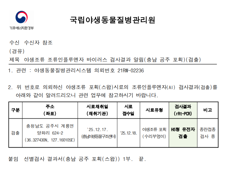 (충남 공주) 야생조류 조류인플루엔자(H5) 항원 검출에 따른 차단방역 및 예찰 강화 알림(충남 공주 양화저수지, 포획)