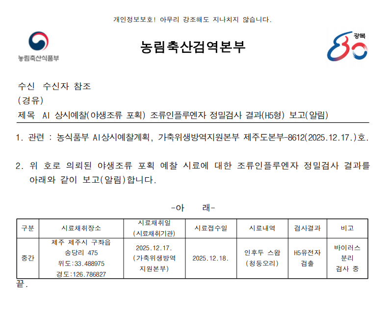 (제주) 야생조류 조류인플루엔자(H5) 항원 검출에 따른 차단방역 및 예찰 강화 알림(제주 송당저수지, 포획)