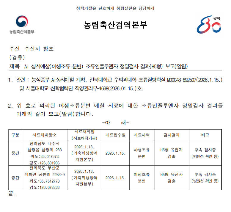 ▼ (전남 나주) 야생조류 조류인플루엔자(H5) 항원 검출에 따른 차단방역 및 예찰 강화 알림 (전북 나주 남평리, 분변)