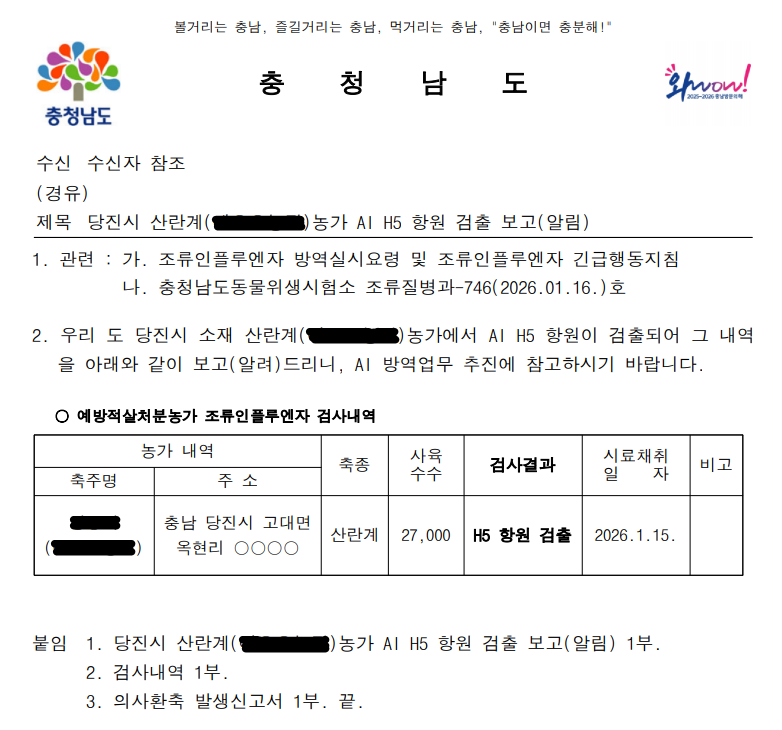 ▲ (충남 당진) 가금농장(산란계) 고병원성 조류인플루엔자(AI) 확진에 따른 방역조치 알림