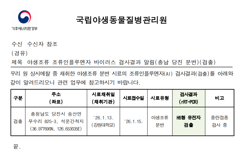 (충남 당진) 야생조류 조류인플루엔자(H5) 항원 검출에 따른 차단방역 및 예찰 강화 알림(충남 당진 석문간척지, 분변)