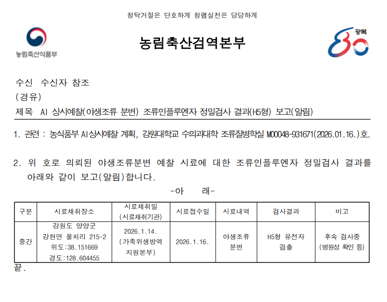 (강원 양양) 야생조류 조류인플루엔자(H5) 항원 검출에 따른 차단방역 및 예찰 강화 알림(강원 양양 물치리, 분변)