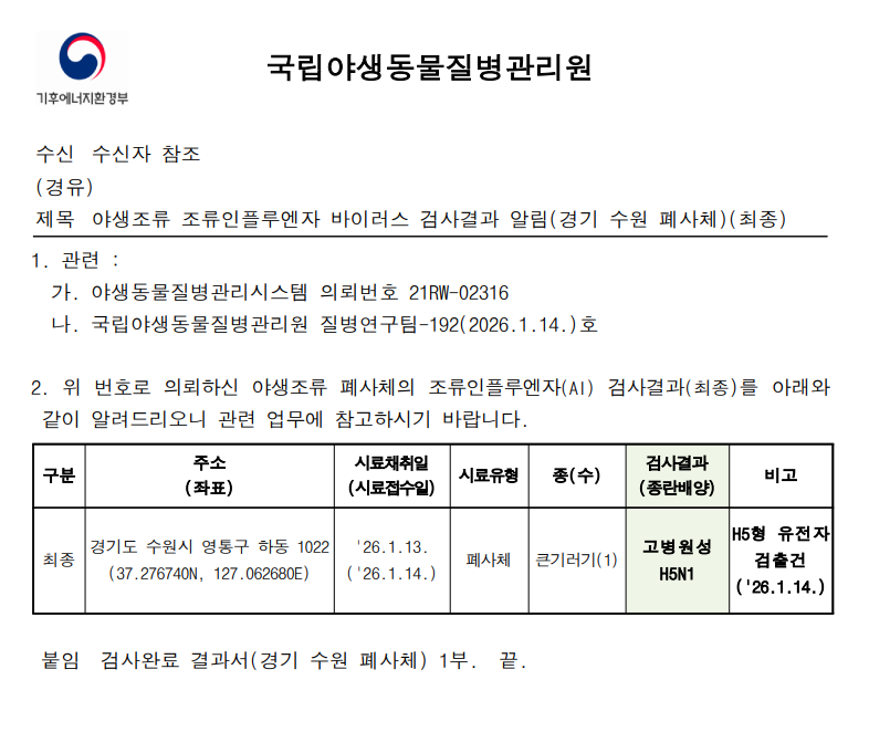 (경기 수원) 야생조류 고병원성 조류인플루엔자(H5N1형) 검출에 따른 차단방역 강화 알림(경기 수원 하동, 폐사체)