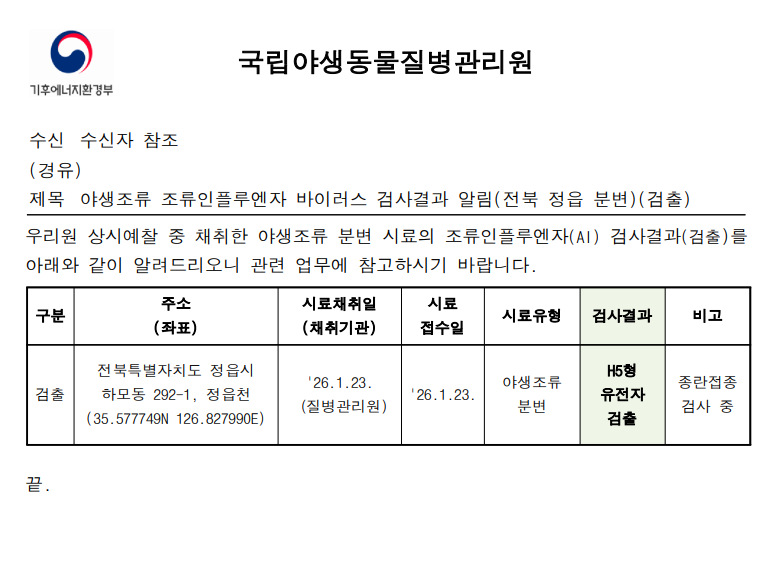 (전북 정읍) 야생조류 조류인플루엔자(H5) 항원 검출에 따른 차단방역 및 예찰 강화 알림(전북 정읍 정읍천, 분변)