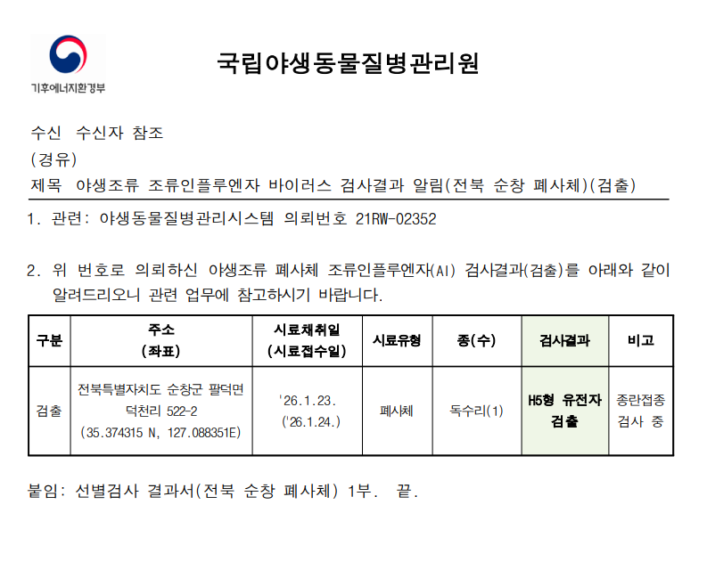 (전북 순창) 야생조류 조류인플루엔자(H5) 항원 검출에 따른 차단방역 및 예찰 강화 알림(전북 순창 덕천리, 폐사체)