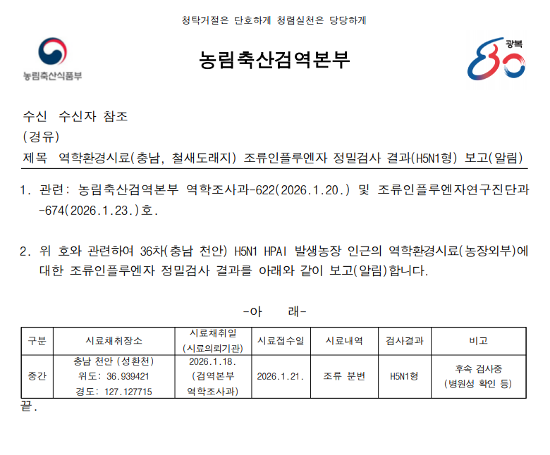 역학 환경시료(충남, 철새도래지) 조류인플루엔자(H5N1) 검출에 따른 차단방역 및 예찰 강화 알림