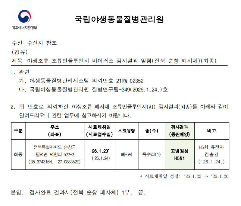 (전북 순창) 야생조류 고병원성 조류인플루엔자(H5N1형) 검출에 따른 차단방역 강화 알림(전북 순창 덕천리, 폐사체)
