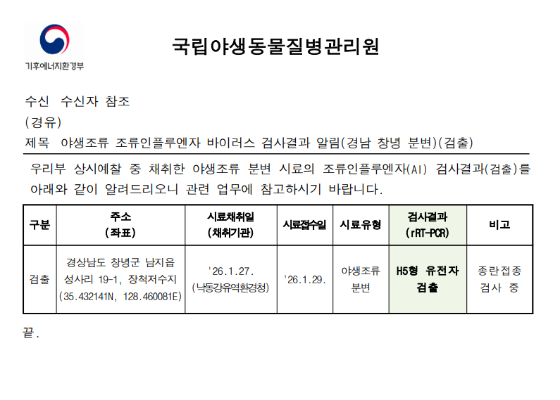 (경남 창녕) 야생조류 조류인플루엔자(H5) 항원 검출에 따른 차단방역 및 예찰 강화 알림(경남 창녕 장척저수지, 분변)