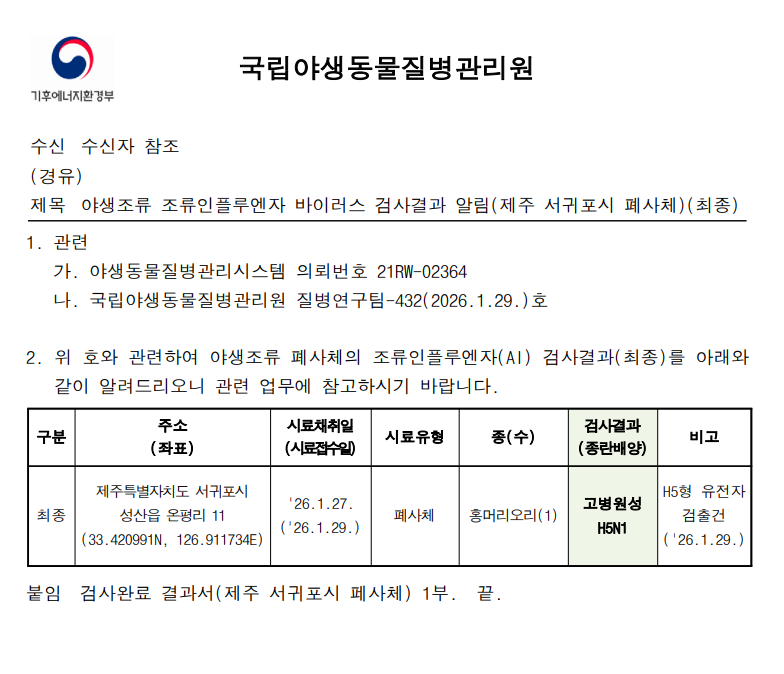 (제주 서귀포) 야생조류 고병원성 조류인플루엔자(H5N1형) 검출에 따른 차단방역 강화 알림(제주 서귀포 온평리, 폐사체)