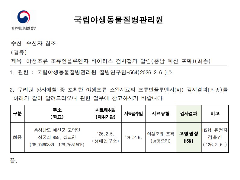 (충남 예산) 야생조류 고병원성 조류인플루엔자(H5N1형) 검출에 따른 차단방역 강화 알림(충남 예산 삽교천, 포획)