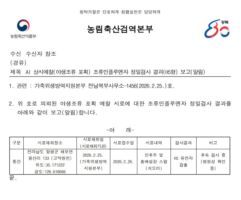 (전남 함평) 야생조류 조류인플루엔자(H5) 항원 검출에 따른 차단방역 및 예찰 강화 알림(전남 함평 고막원천, 포획)