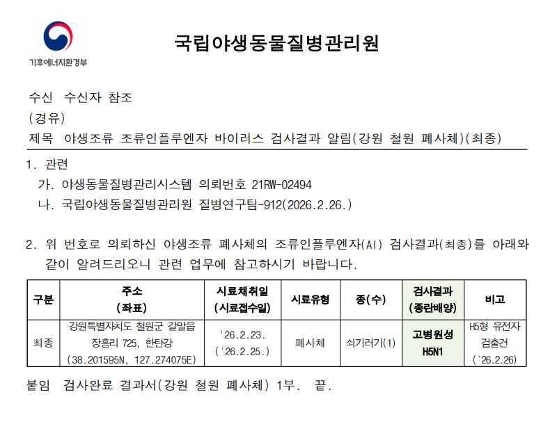 (강원 철원) 야생조류 고병원성 조류인플루엔자(H5N1형) 검출에 따른 차단방역 강화 알림(강원 철원 한탄강, 폐사체)
