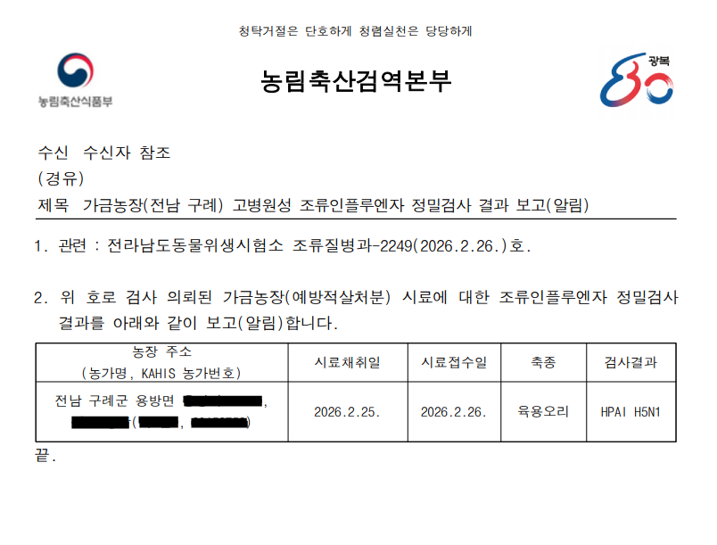 (전남 구례) 예방적 살처분 가금농장(육용오리) 고병원성 조류인플루엔자(AI) 확진에 따른 방역조치 알림