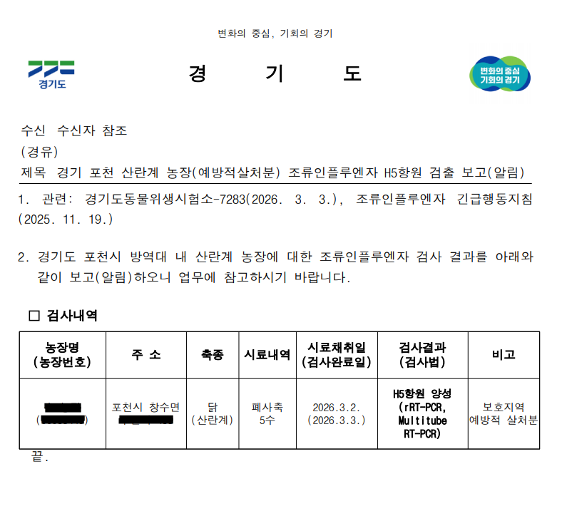 (경기 포천) 예방적 살처분 가금농장(산란계) 고병원성 AI 의사환축 발생에 따른 방역강화 조치