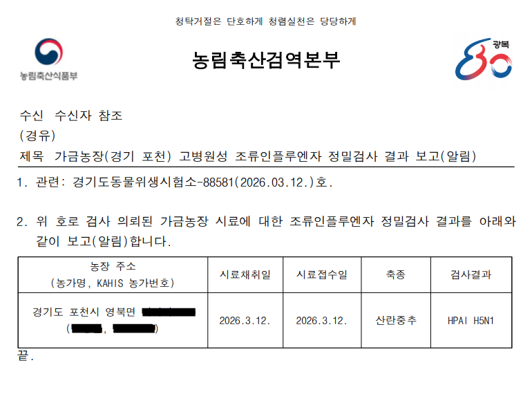 (경기 포천) 가금농장(산란중추) 고병원성 조류인플루엔자(AI) 확진에 따른 방역조치 알림