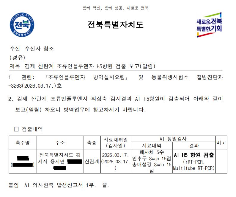 ▲ (전북 김제) 가금농장(산란계) 고병원성 조류인플루엔자(AI) 확진에 따른 방역조치 알림