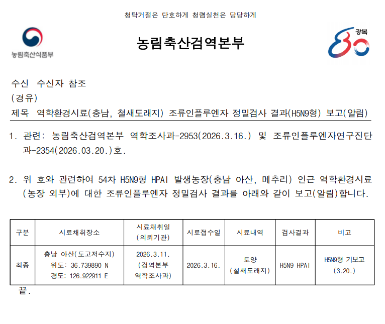 역학 환경시료(충남, 철새도래지) 고병원성 조류인플루엔자(H5N9형) 검출에 따른 차단방역 및 예찰 강화 알림