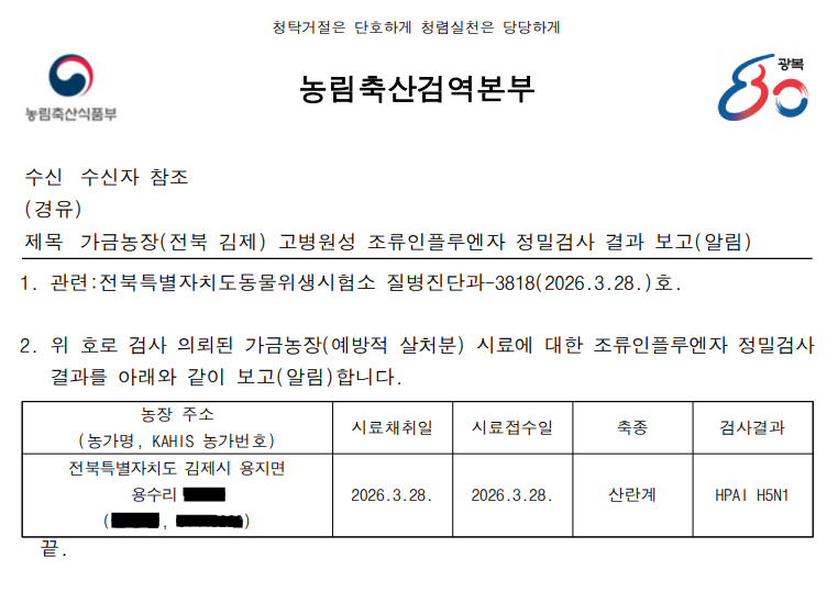 (전북 김제) 예방적 살처분 가금농장(산란계) 고병원성 조류인플루엔자(AI) 확진에 따른 방역조치 알림