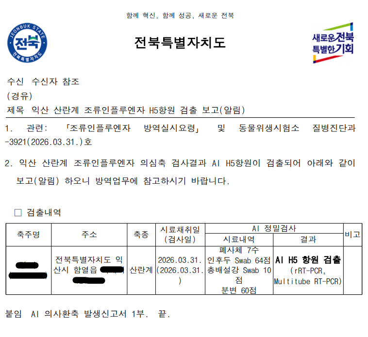 (전북 익산) 가금농장(산란계) 고병원성 AI 의사환축 발생에 따른 방역강화 조치