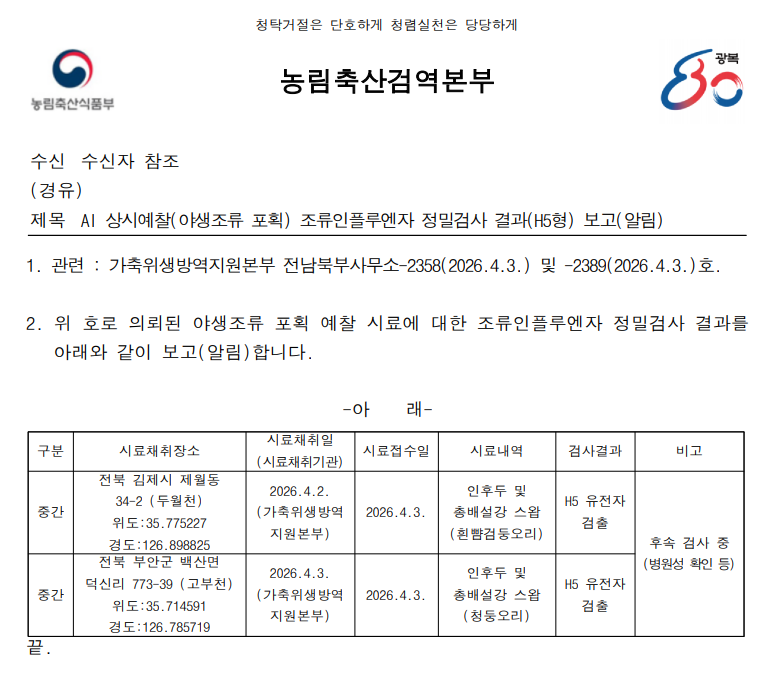▲ (전북 부안) 야생조류 조류인플루엔자(H5) 항원 검출에 따른 차단방역 및 예찰 강화 알림(전북 부안 고부천, 포획)
