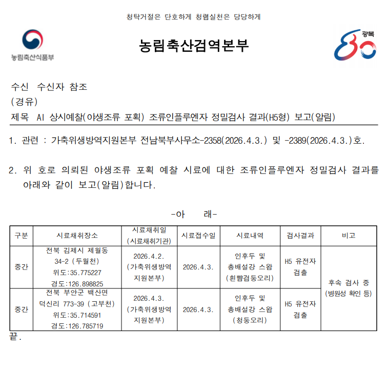 ▼ (전북 김제) 야생조류 조류인플루엔자(H5) 항원 검출에 따른 차단방역 및 예찰 강화 알림(전북 김제 두월천, 포획)
