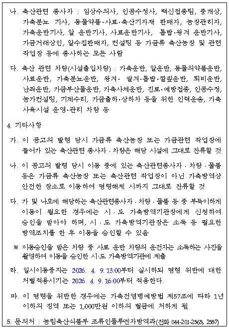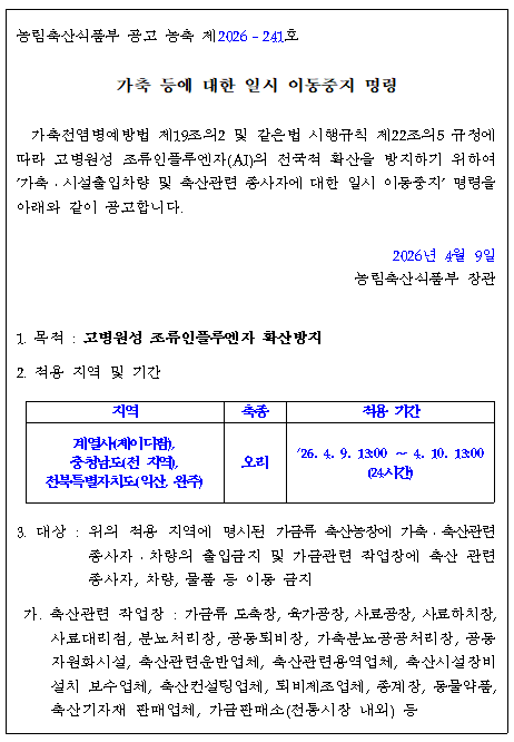 [농식품부] 가축(오리) 등에 대한 일시 이동중지(Standstill) 명령 발령 알림
