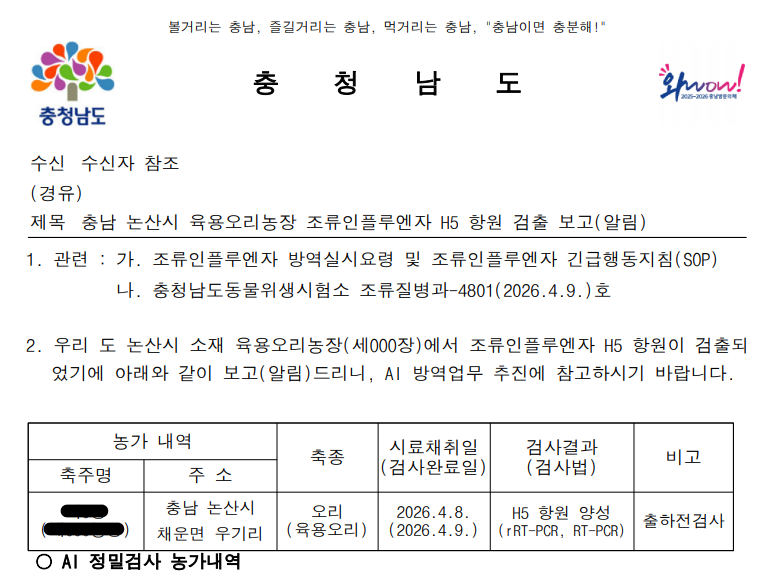 ▲ (충남 논산) 가금농장(육용오리) 고병원성 조류인플루엔자(AI) 확진에 따른 방역조치 알림
