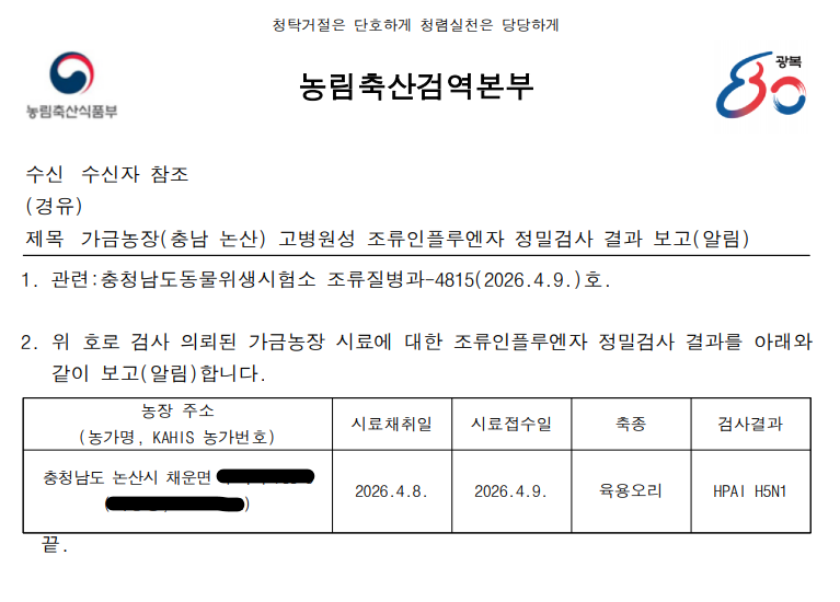 (충남 논산) 가금농장(육용오리) 고병원성 조류인플루엔자(AI) 확진에 따른 방역조치 알림