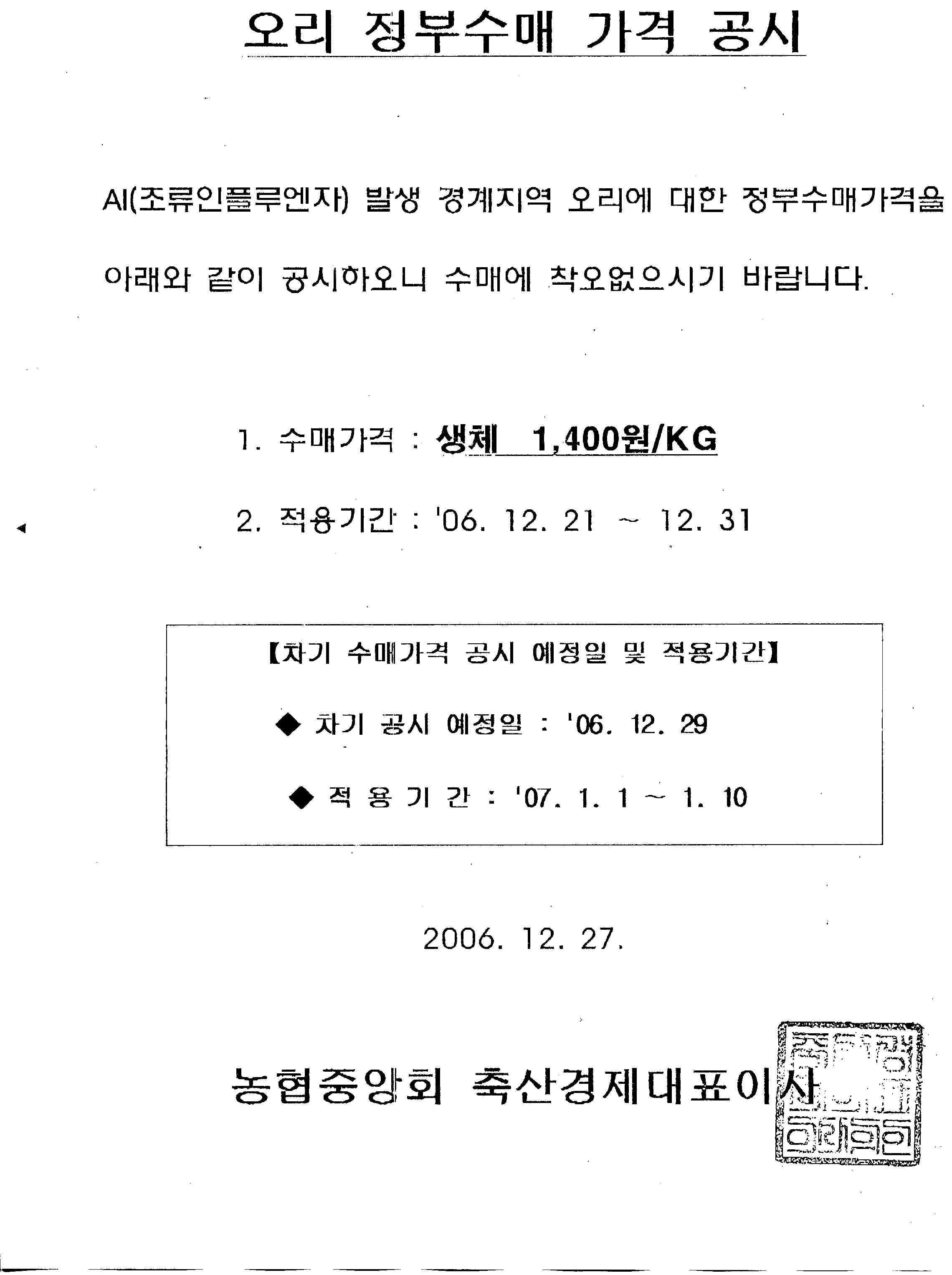 AI 발생 경계지역 오리에 대한 정부 수매가격 공시 1. 수매가격기준: 전순평균가격을 익일부터 10일간 적용 (12.11 ~ 12.20 기간중 산지평균가격) 2. 수매가격 적용기간: 12.21 ~ 12.31 까지 수매분 3. 수매가격: 생체 Kg당 1,400원 4. 가격공시 첨부물참조