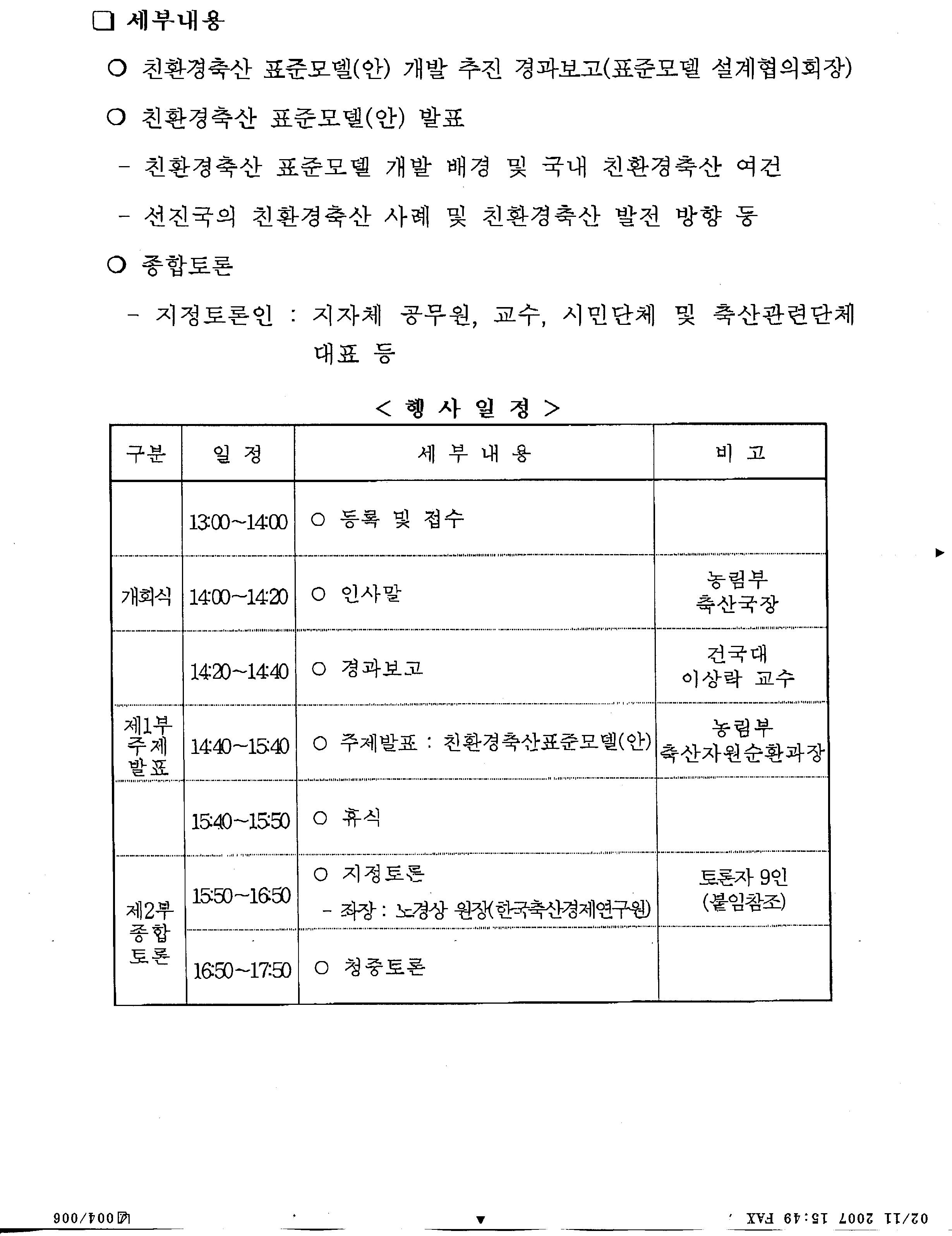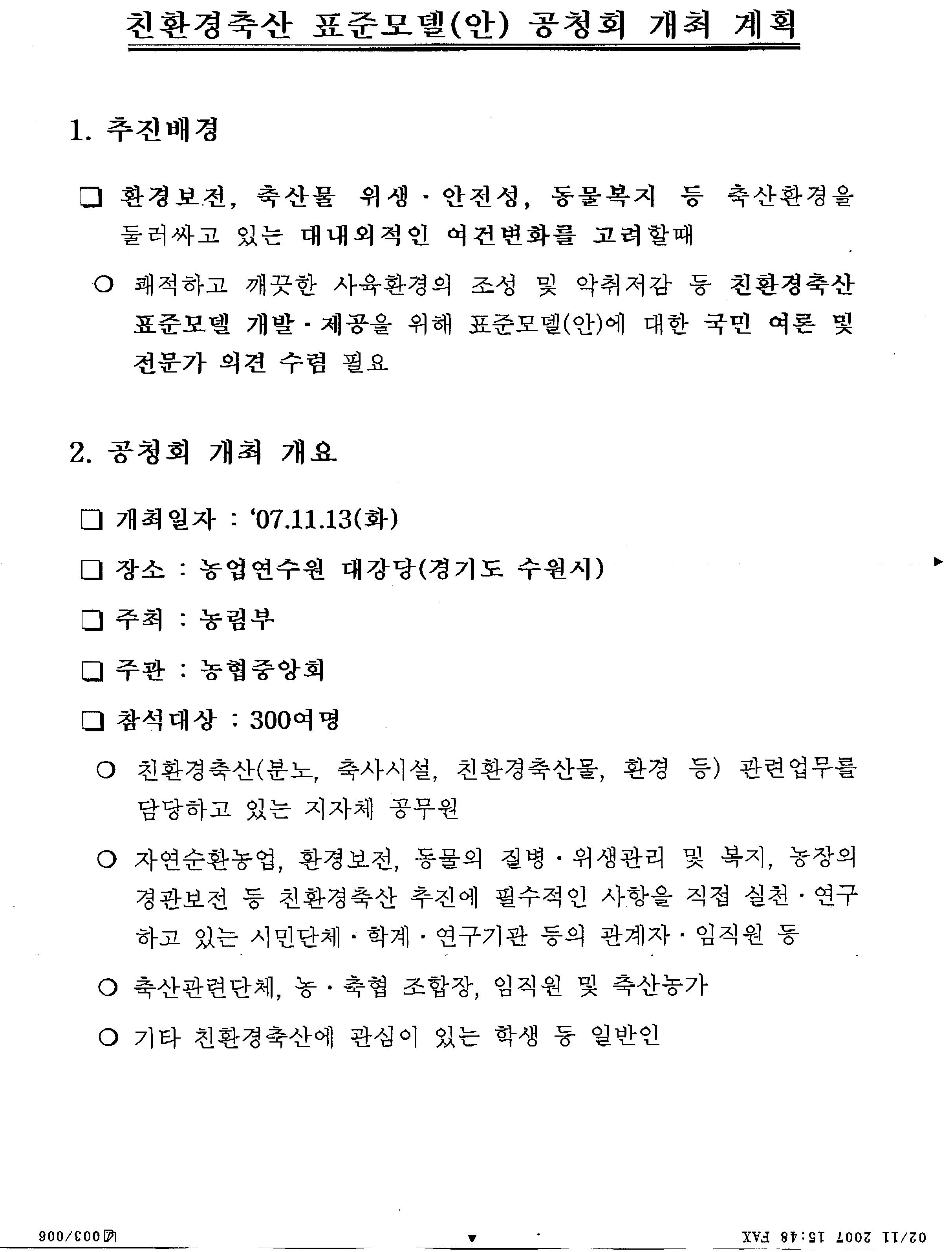 사본 - 2.jpgo 농림부에서는 환경보전에 대한 대내외적인 관심증가, 안전성과 품질 중심으로 변화한 농축산물의 구매패턴 및 동물복지개념을 도입한 가축사육 환경조성요구 등 급변하는 축산환경의 변화로 부터 축산업을 지속 가능한 산업으로 성장시키기 위해 자연환경과의 조화, 소비자로부터의 신뢰회복 및 가축의 건강성 유지, 주변 경관과 조화되는 깨끗하고 친환경적인 축산에 대한 바람직한 방향을 제시하고자 "친환경축산 표준모델(안)"을 마련하여 아래와 같이 공청회를 개최하니 관련 지자체 공무원, 시민단체, 학계, 연구기관 및 축산관련단체, 농축협관계자와 친환경 축산에 관심이 있는 여러분이 참석하셔서 많ㅇ은 의견을 개진하여주시기를 바랍니다. o 일시: 2007. 11. 13(화) 오후 2시 ~ 6시 o 장소: 농업연수원 대강당 (수원시 서둔동 농촌진흥청 서문 맞은편) * 세부계획 붙임참조