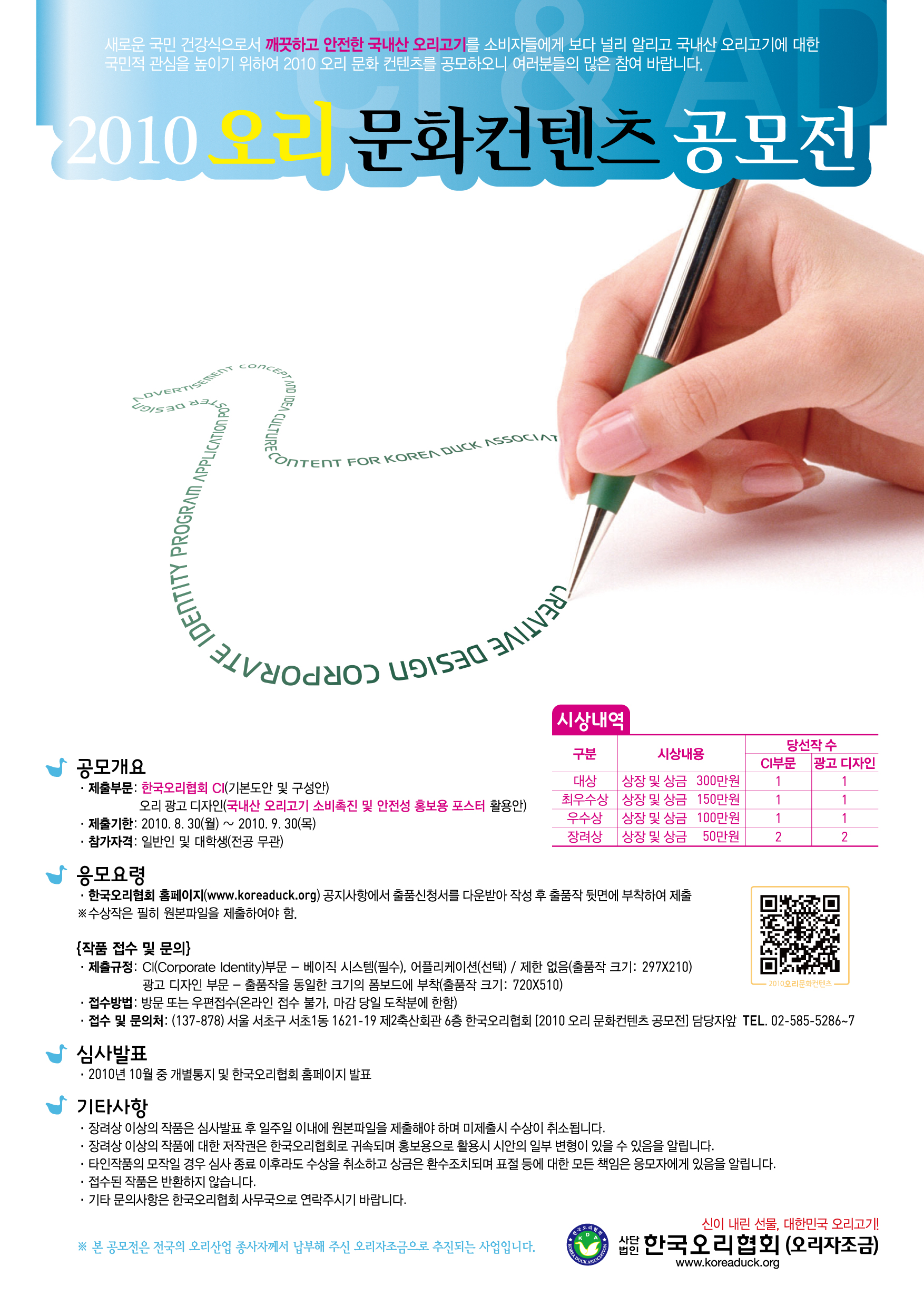 한국오리협회는 새로운 국민 건강식으로서 깨끗하고 안전한 국내산 오리고기를 소비자들에게 보다 널리 알리는 한편 국민적 관심을 높이기 위하여 '2010 오리 문화컨텐츠 공모전'을 개최코자 합니다. 공모작은 한국오리협회 CI 부문과 오리 광고 디자인 안 2가지로 진행되며, 접수기한은 2010년 8월 30일(월)부터 9월 30일(목)까지입니다.