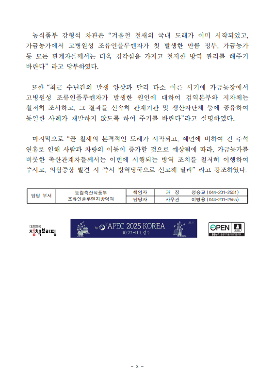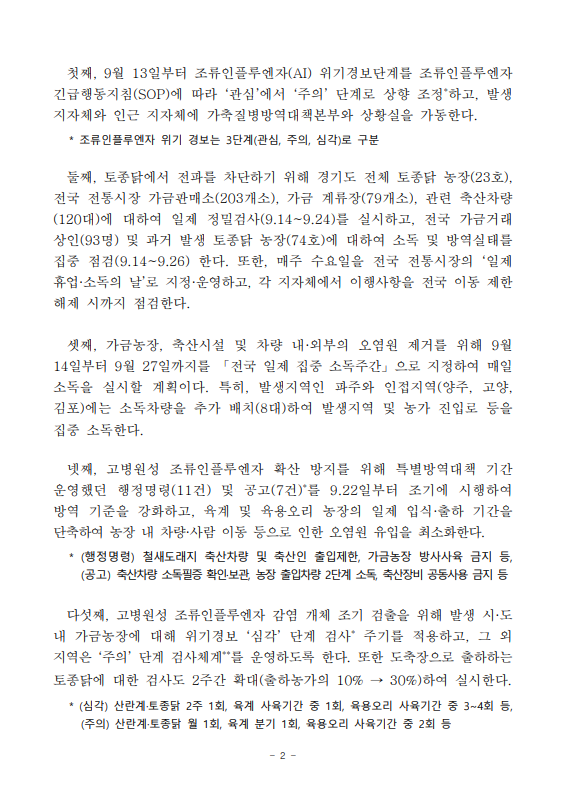 [농식품부 09.13] 고병원성 조류인플루엔자 국내 가금농장(경기 파주시) 첫 발생에 따라 방역관리 강화 중