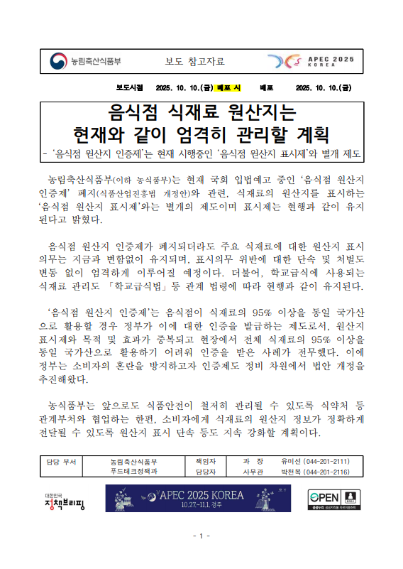 [농식품부 10.10] 음식점 식재료 원산지는 현재와 같이 엄격히 관리할 계획