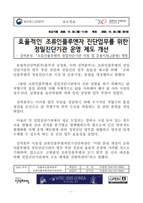 [검역본부 10.20] 효율적인 조류인플루엔자 진단업무를 위한 정밀진단기관 운영 제도 개선
