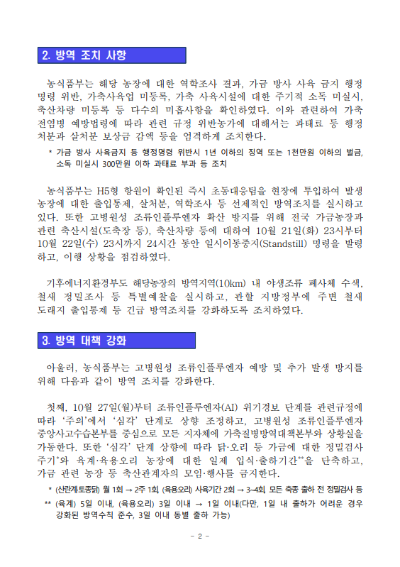 ▼ [농식품부 10.22] 농식품부와 행안부 합동으로 겨울 철새 본격 도래시기에 대비하여 조류인플루엔자 방역실태 현장점검