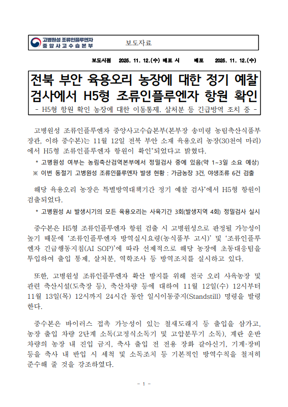 [농식품부 11.12] 전북 부안 육용오리 농장에 대한 정기 예찰 검사에서 H5형 조류인플루엔자 항원 확인