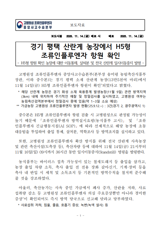 [농식품부 11.14] 경기 평택 산란계 농장에서 H5형 조류인플루엔자 항원 확인