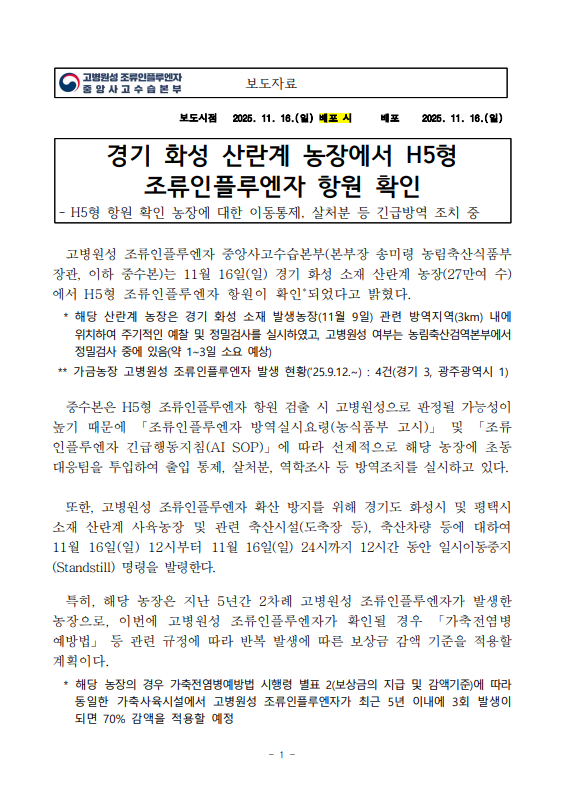 [농식품부 11.16] 경기 화성 산란계 농장에서 H5형 조류인플루엔자 항원 확인