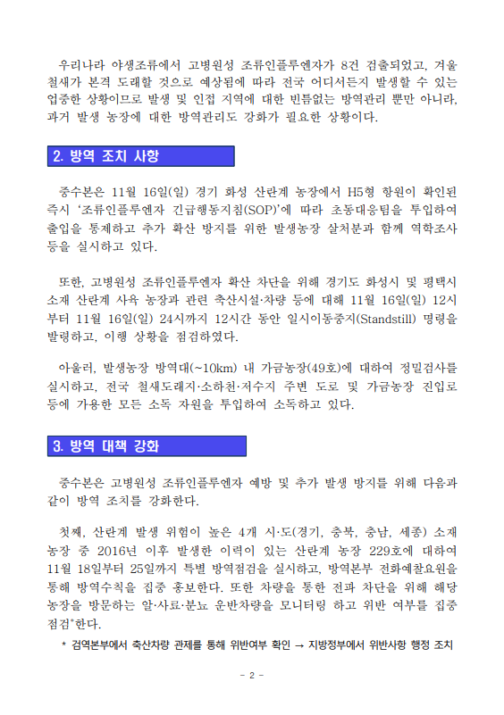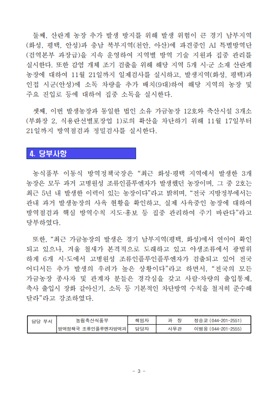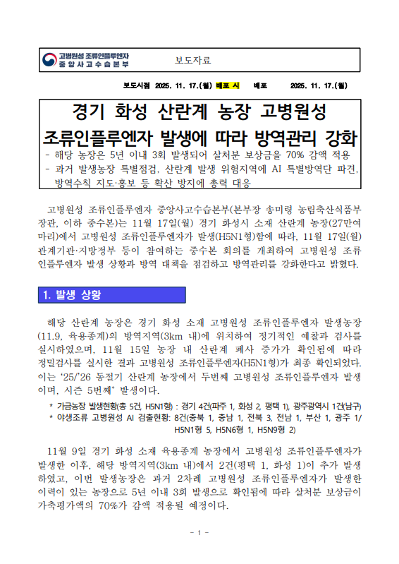 [농식품부 11.17] 경기 화성 산란계 농장 고병원성 조류인플루엔자 발생에 따라 방역관리 강화