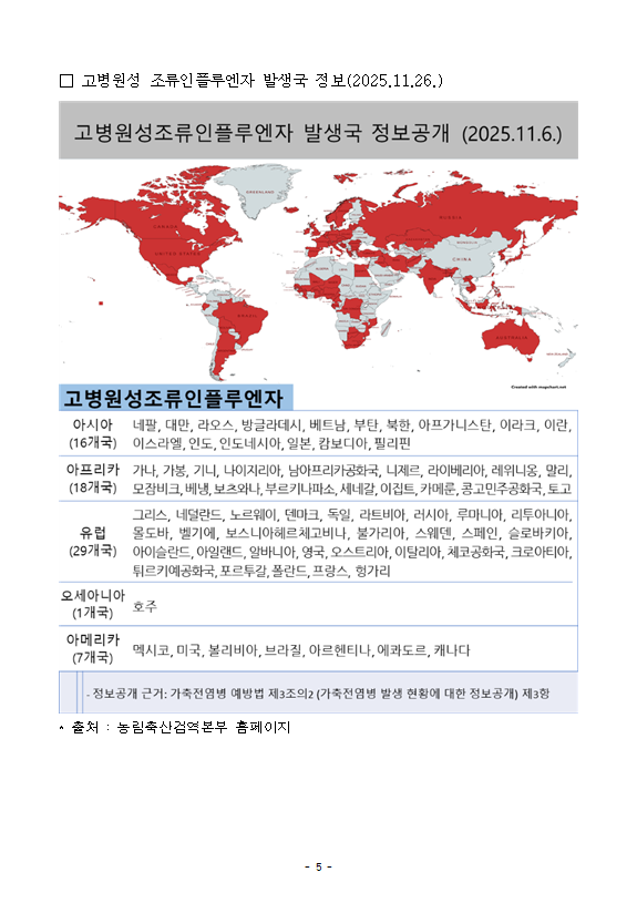 ▲ [농식품부 11.21] 국내 고병원성 조류인플루엔자 발생 위험도 커져 추가 발생 방지를 위한 방역 강화