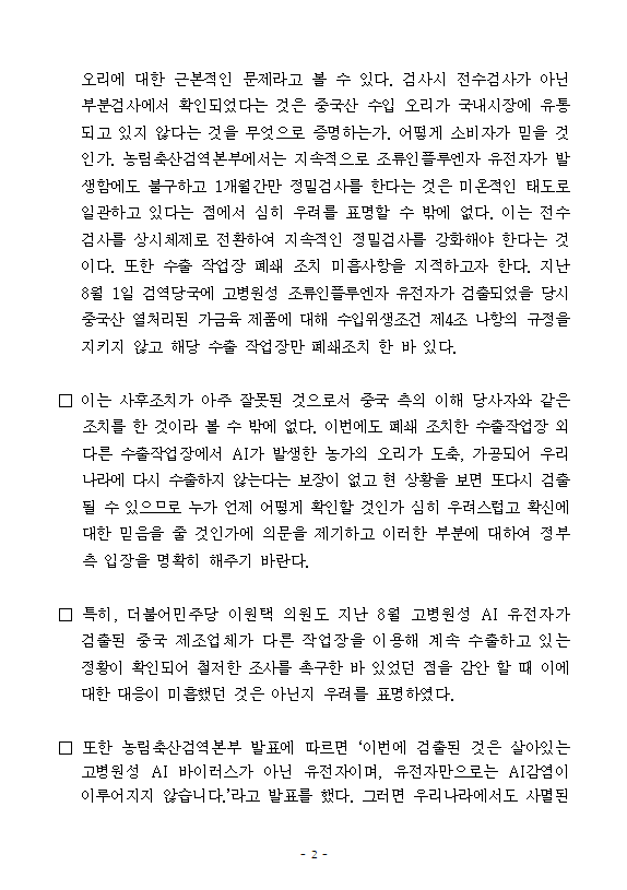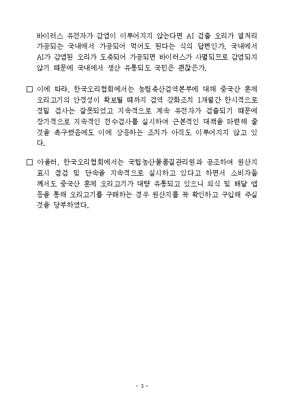 [한국오리협회 보도자료] 중국산 수입 훈제오리고기, 조류인플루엔자 유전자 재차 검출