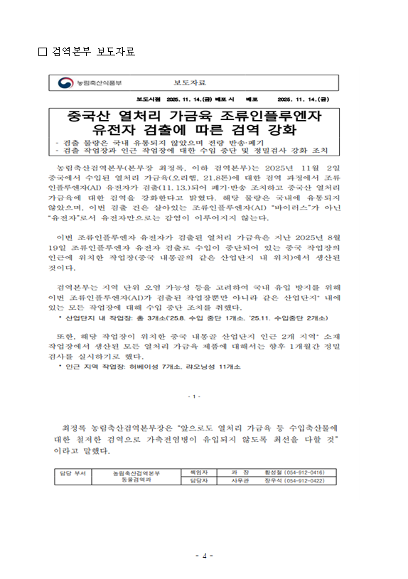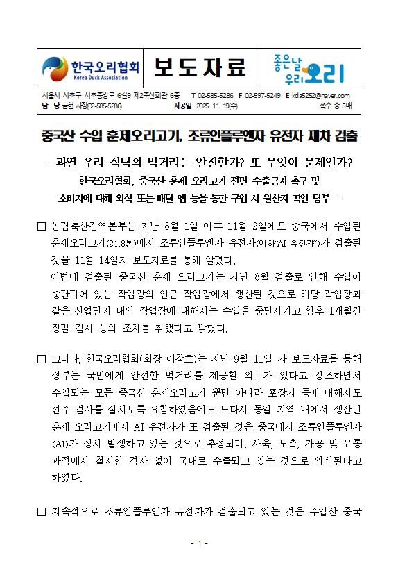 첨부파일 : 251119 (보도자료) 중국산 수입 훈제오리고기, 조류인플루엔자 유전자 재차 검출.hwp