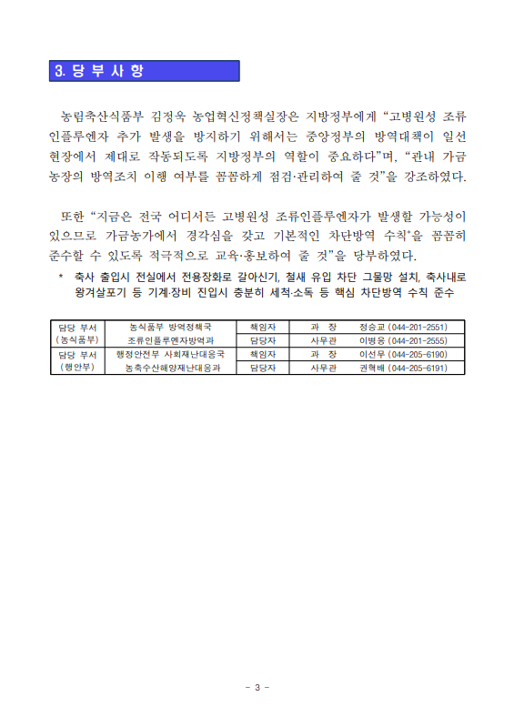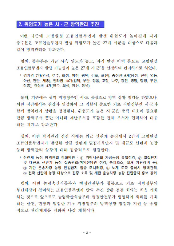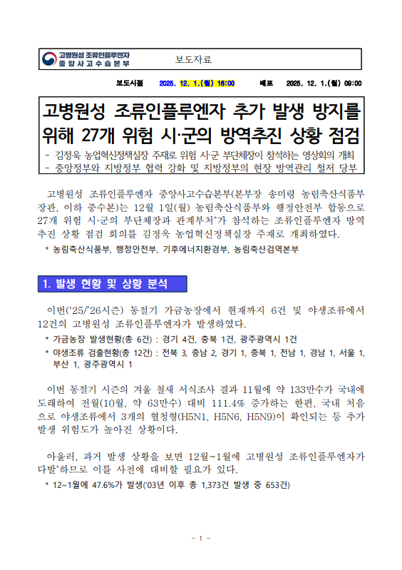 [농식품부 12.01] 고병원성 조류인플루엔자 추가 발생 방지를 위해 27개 위험 시·군의 방역추진 상황 점검