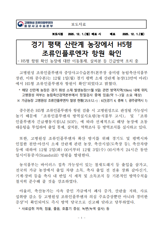 [농식품부 12.01] 경기 평택 소재 산란계 농장에서 H5형 조류인플루엔자 항원 확인