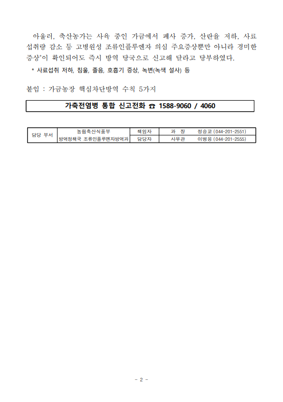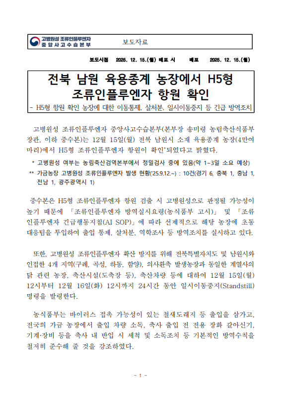 [농식품부 12.15] 전북 남원 소재 육용종계 농장에서 H5형 조류인플루엔자 항원 확인