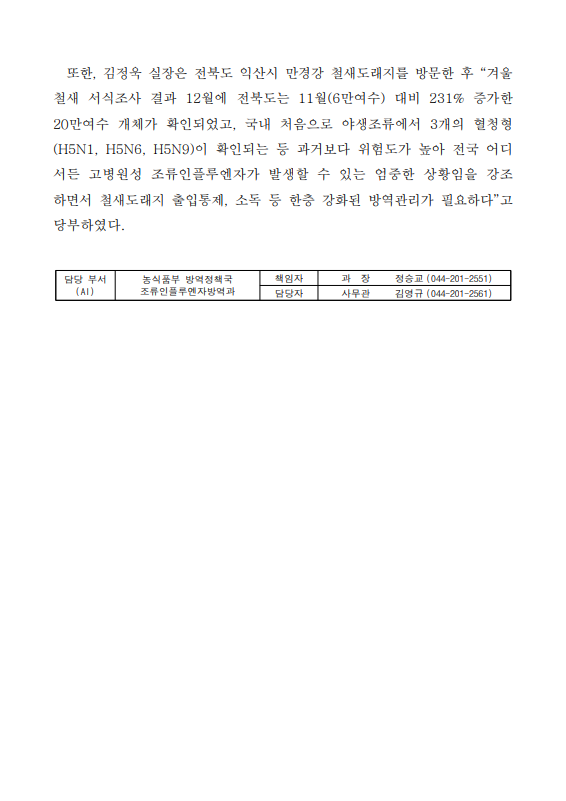 [농식품부 12.19] 농식품부, 전북지역 철새도래지 방역관리 실태 현장점검