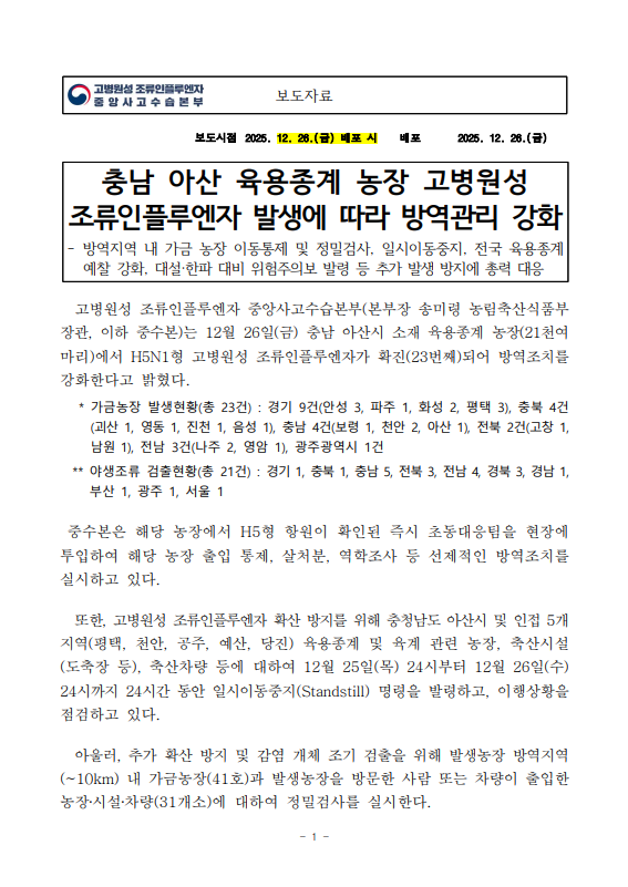 [농식품부 12.26] 충남 아산 육용종계 농장 고병원성 조류인플루엔자 발생에 따라 방역관리 강화